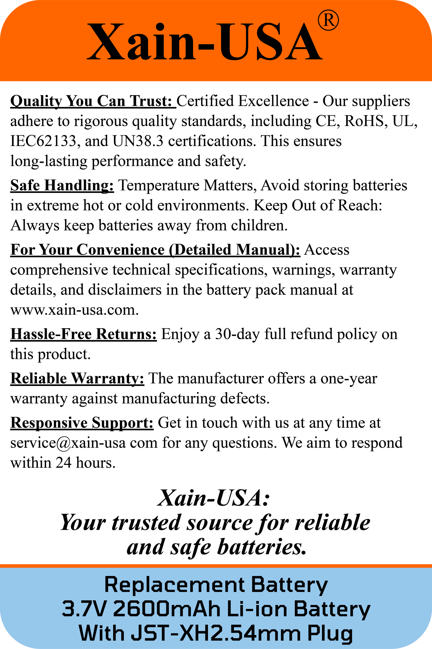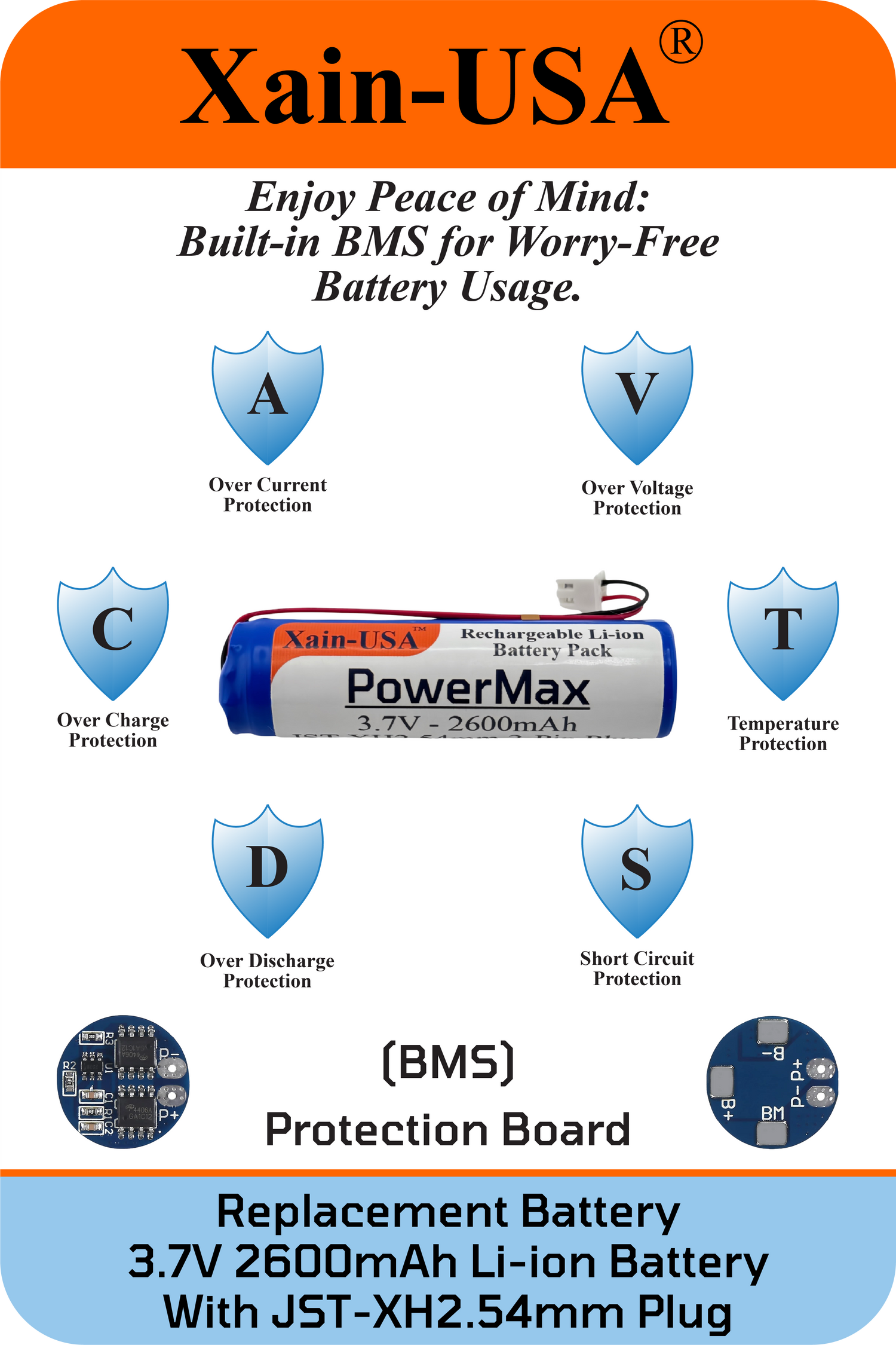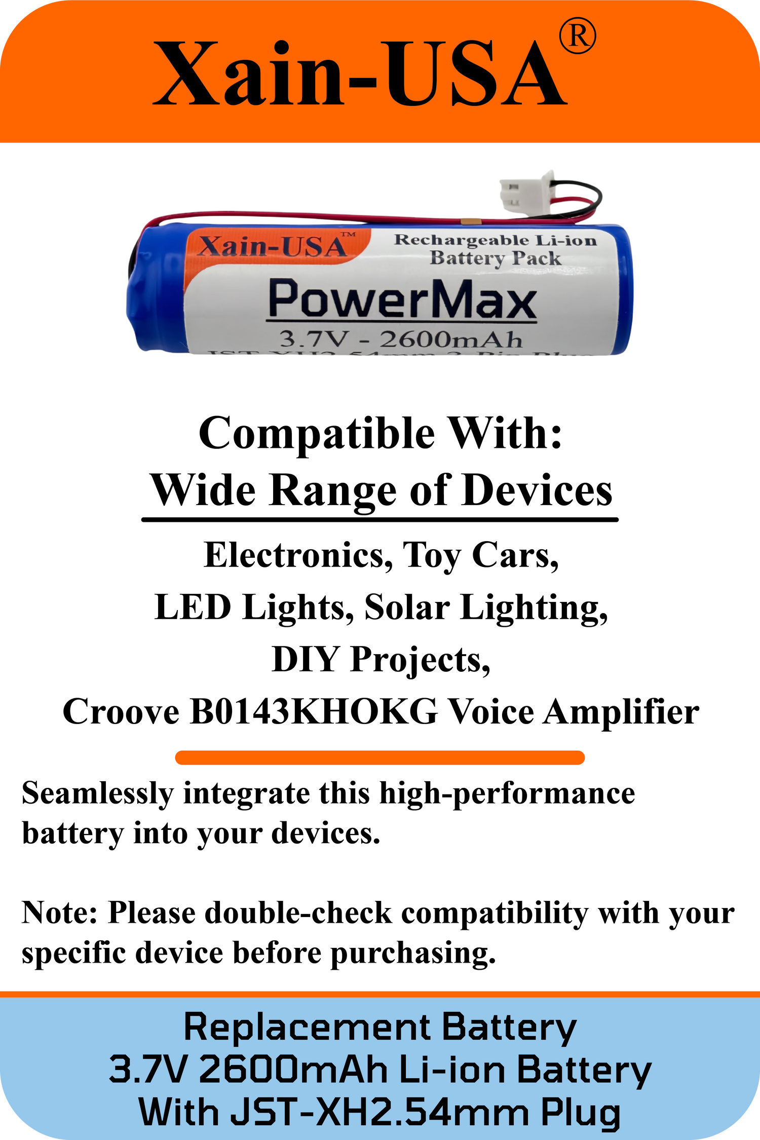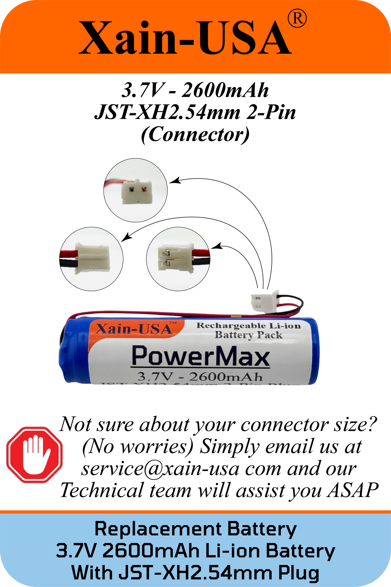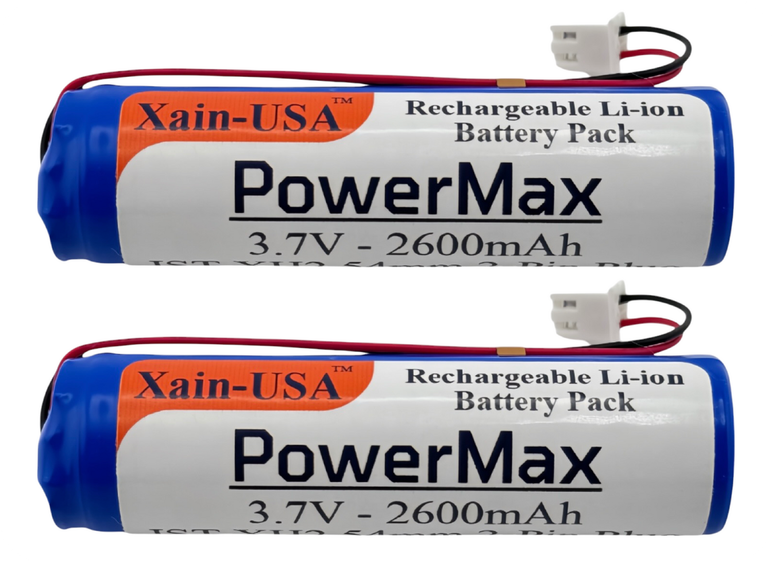 (2-Pack) 3.7V 2600mAh Li-ion Battery Pack (9.62Wh) with JST-XH 2-Pin Connector – Rechargeable 1S Pack for RC Cars, Robots, LED Lights, Portable Electronics, DIY Electronics Products