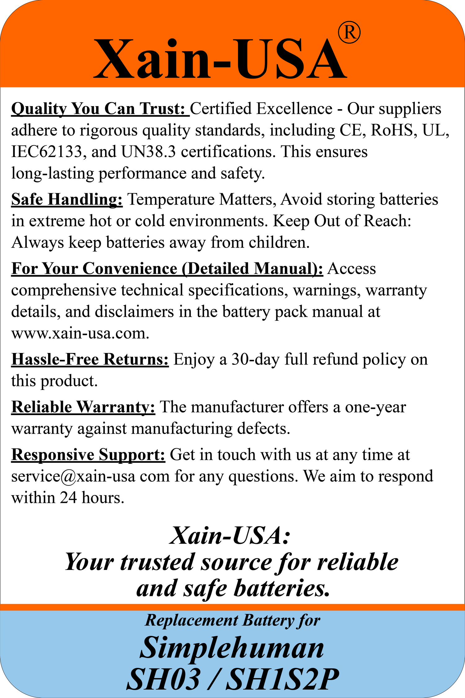 High-Capacity Replacement Battery for Simplehuman SH03, SH1S2P – 3.7V 5200mAh (19.24Wh) with Built-in BMS – Lasts 2X Longer Than Standard Packs is backordered and will ship as soon as it is back in stock.