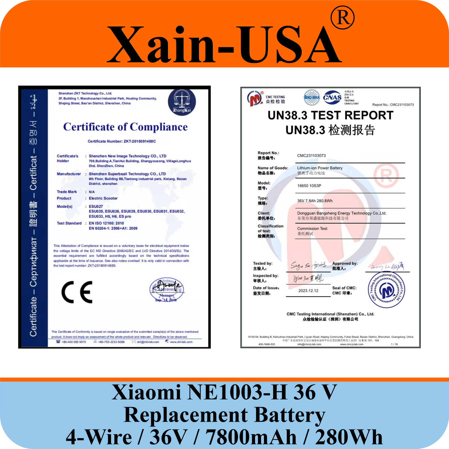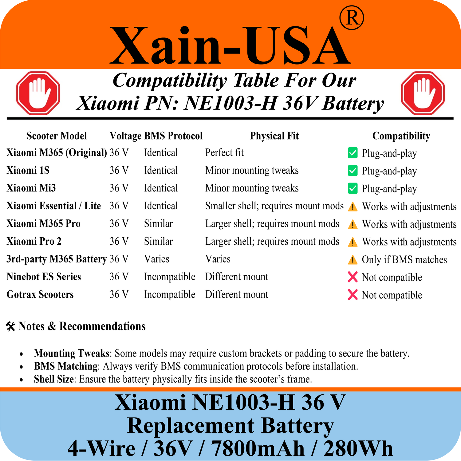 High-Performance Replacement Battery For Xiaomi M365 PN: NE1003-H (36V 7800mAh, 280Wh) with Built-in Communication Protocol. Please See Our Catalog for Xiaomi Scooter Compatibility List.