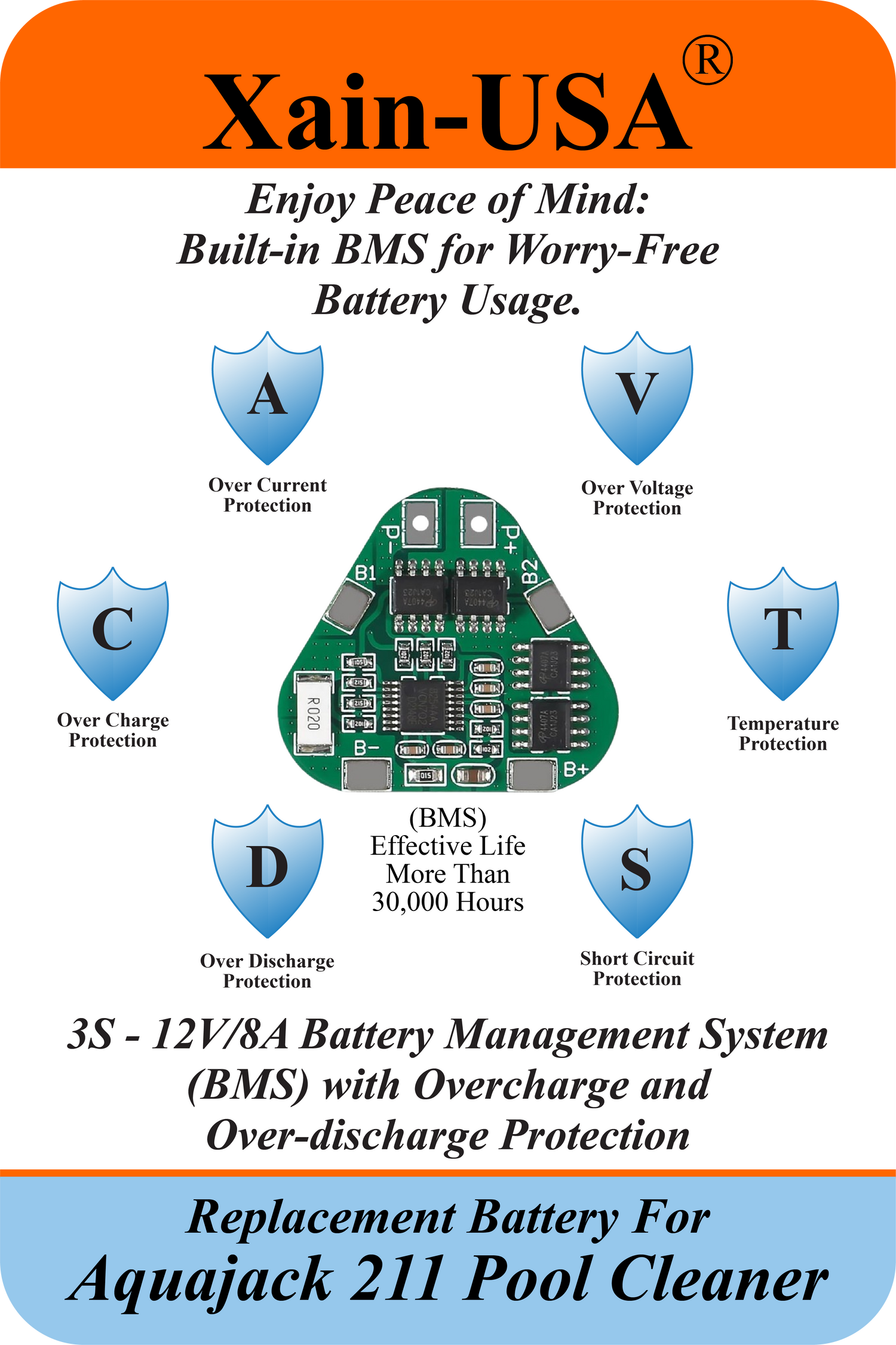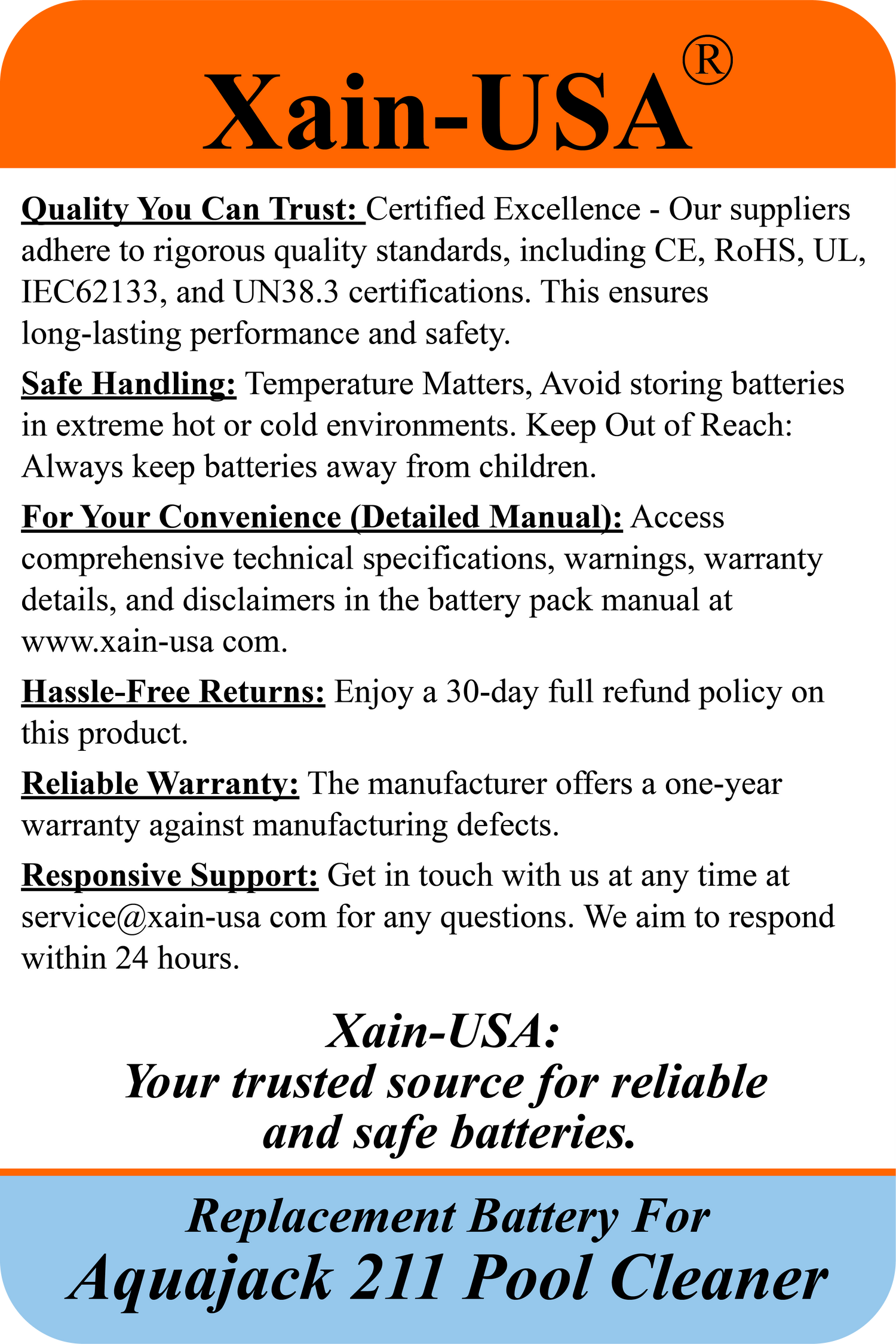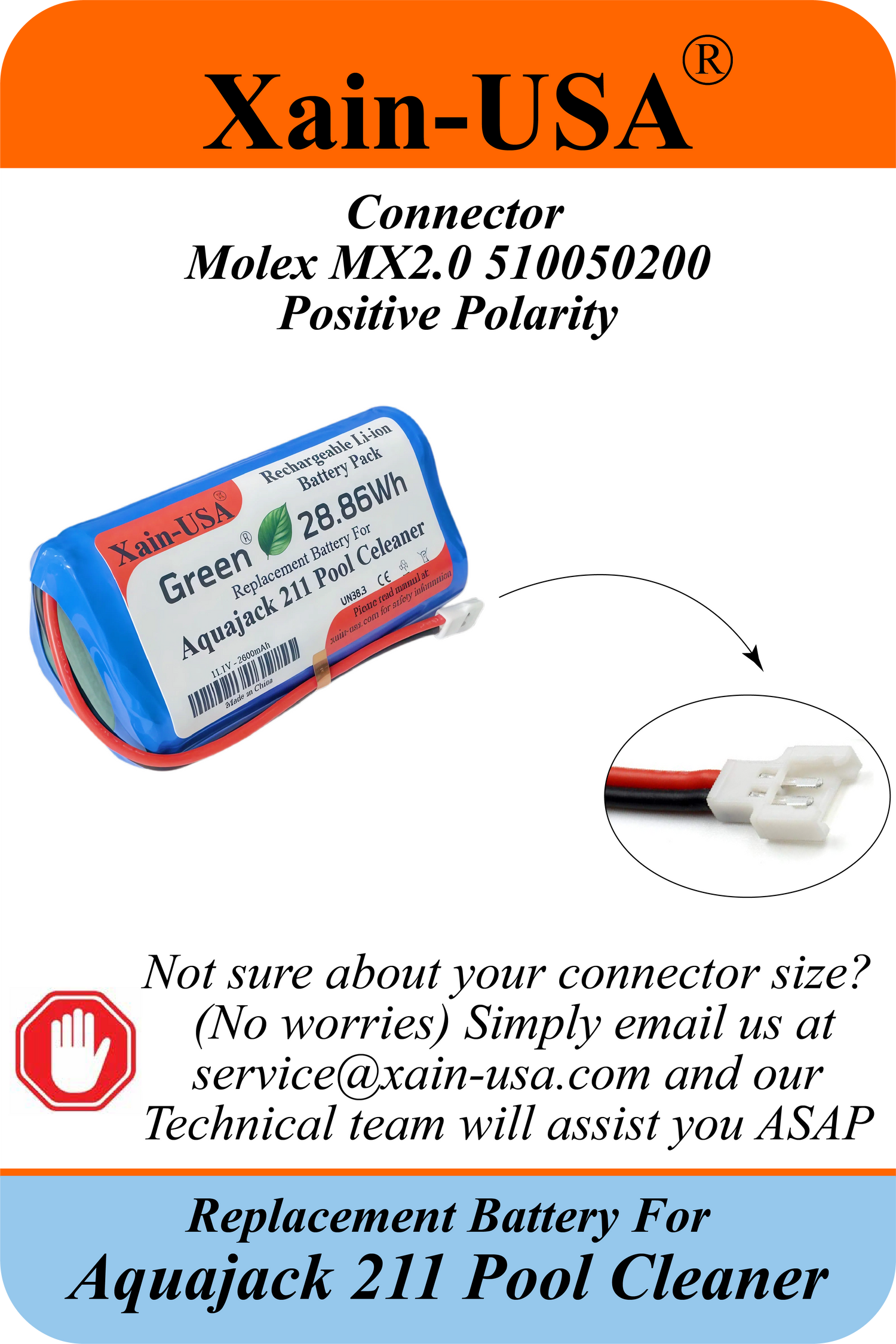 Long-Life Lithium-ion Replacement Battery for Aquajack 211 Pool Cleaner | High-Performance Xain-Xtra Cell 1000+ Charge/Discharge Cycles / 11.1V 2600mAh