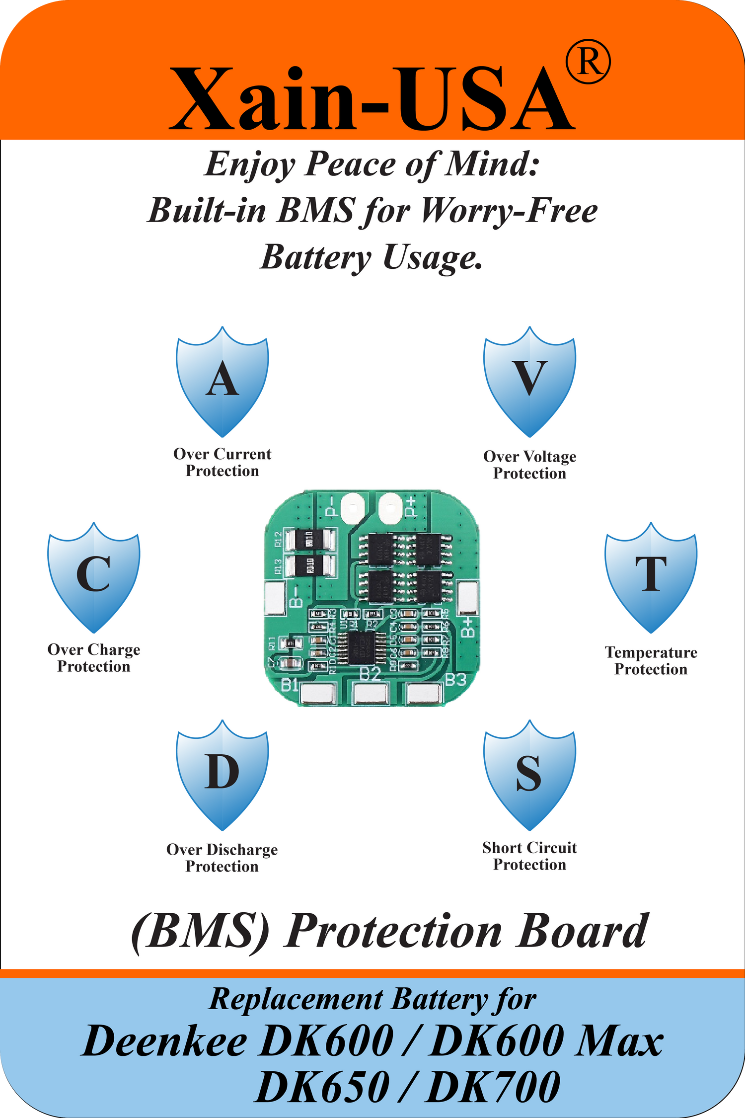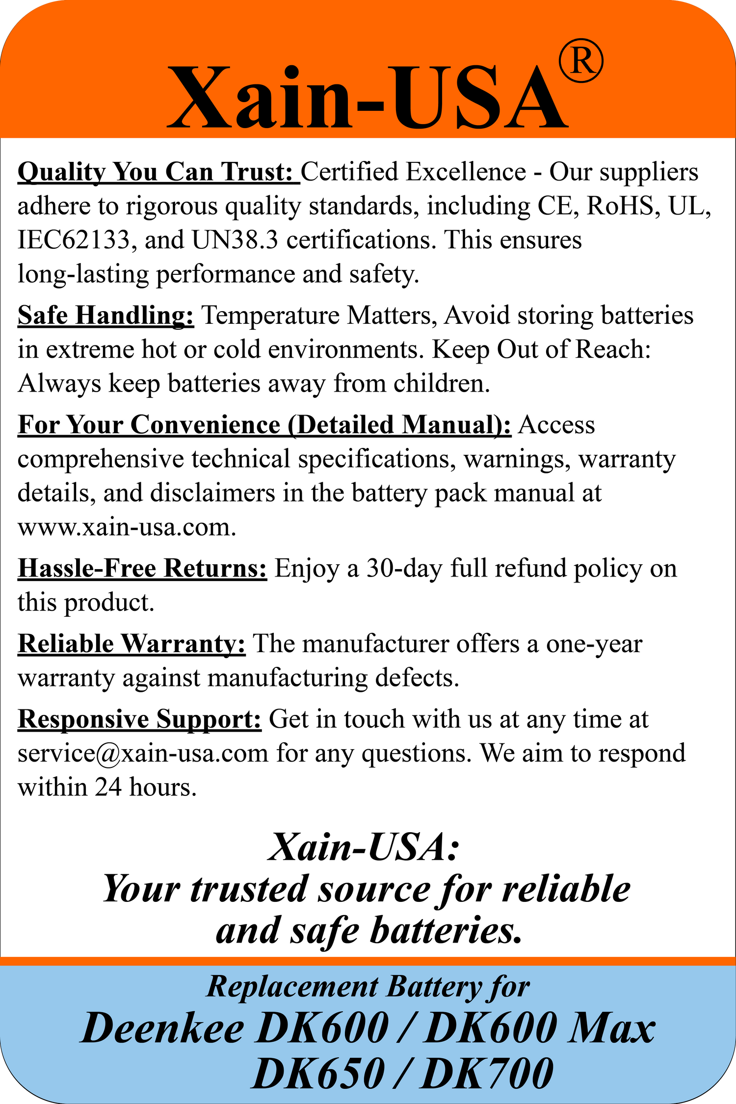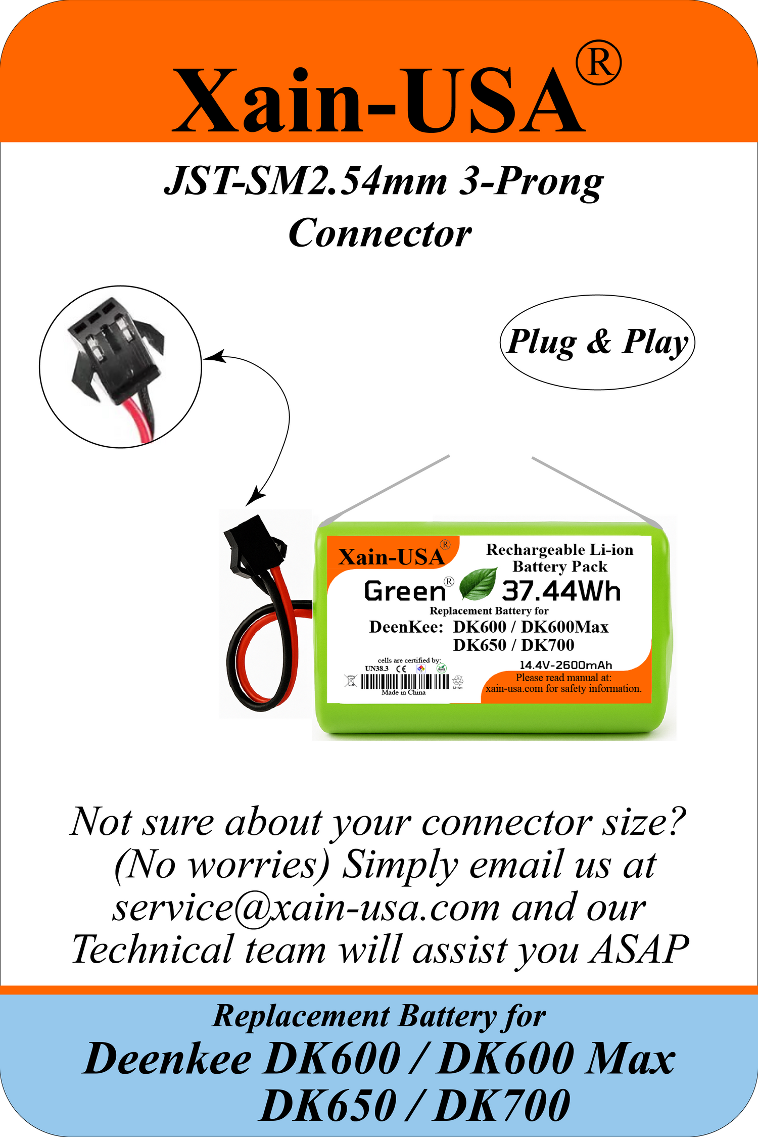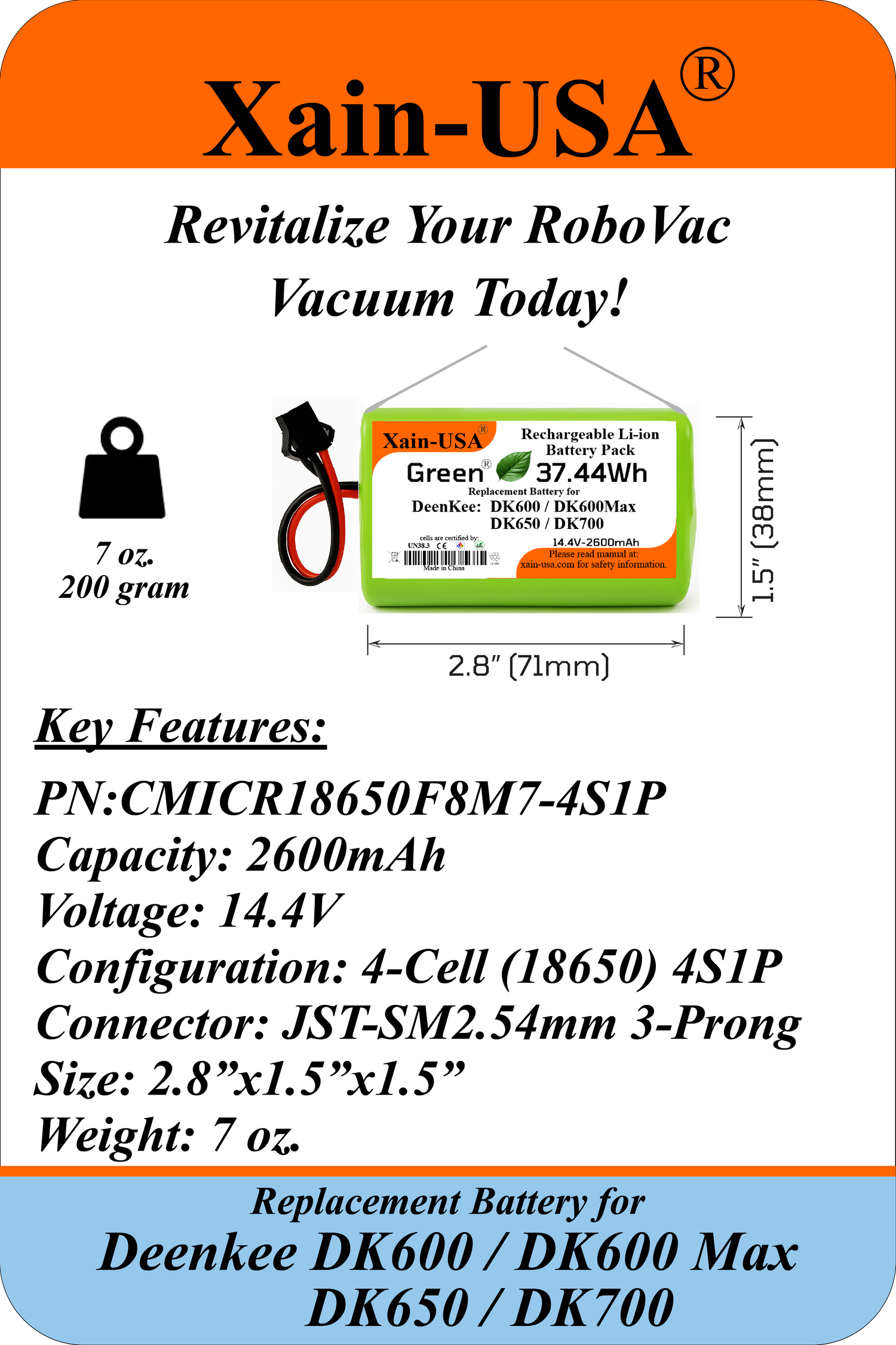 (Xain-Vac) Premium Replacement Battery for Deenkee DK600 / DK600 Max / DK650 / DK700 Robot Vacuum Cleaners 14.4V - 2600mAh (37.4Wh) with Built-in Battery Management System (BMS) is backordered and will ship as soon as it is back in stock.
