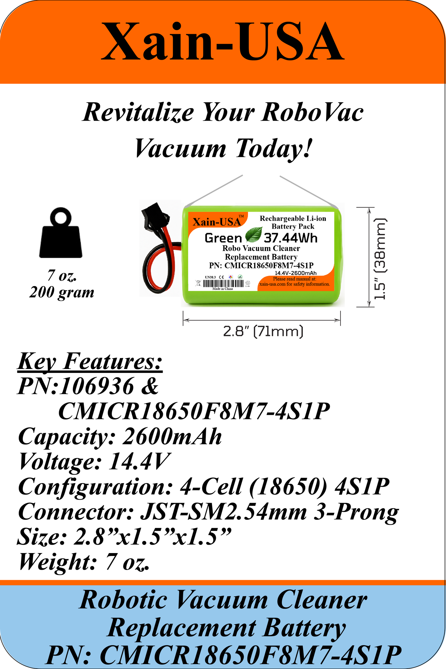 • Power Rating: Voltage: 14.4V, Capacity: 2600mAh (37.4Wh)